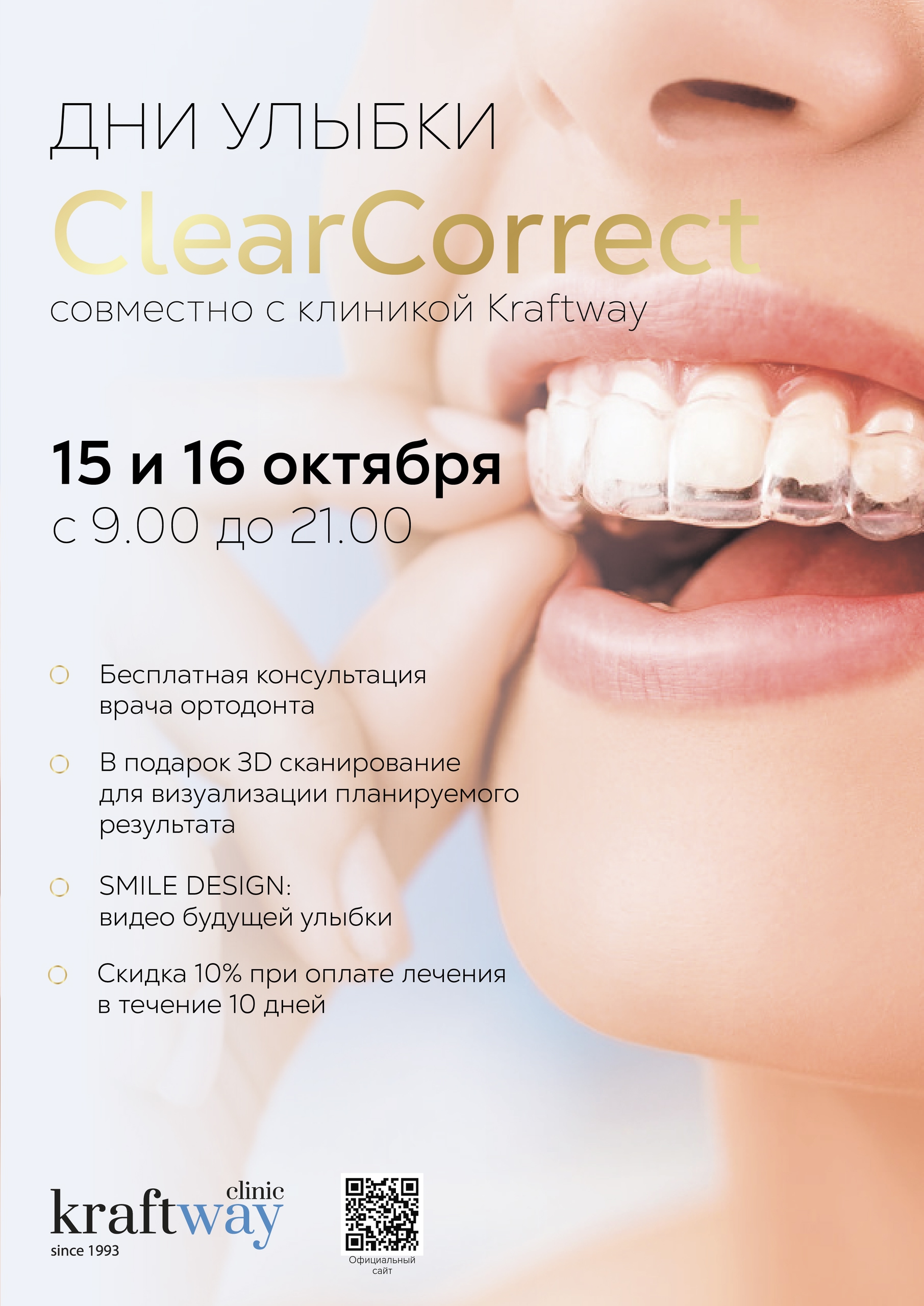 • 15 и 16 октября: ДНИ КРАСИВЫХ УЛЫБОК СОВМЕСТНО С РЕВОЛЮЦИОННОЙ СИСТЕМОЙ ЭЛАЙНЕРОВ CLEAR CORRECT (Клир Коррект)